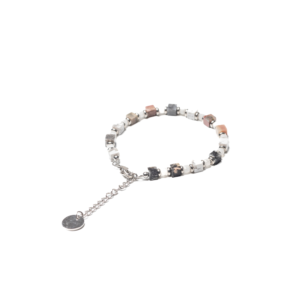 以4mm正方形切割的天然水晶,包含白松石、月光石、紅紋石與印度瑪瑙的和諧組合,展現出自然與靈性兼具的優雅氣息。每一顆水晶皆為天然珍品,賦予佩戴者內在平靜、愛與人際和諧的正向能量,可調式手圍適合日常佩戴或作為祝福禮物。