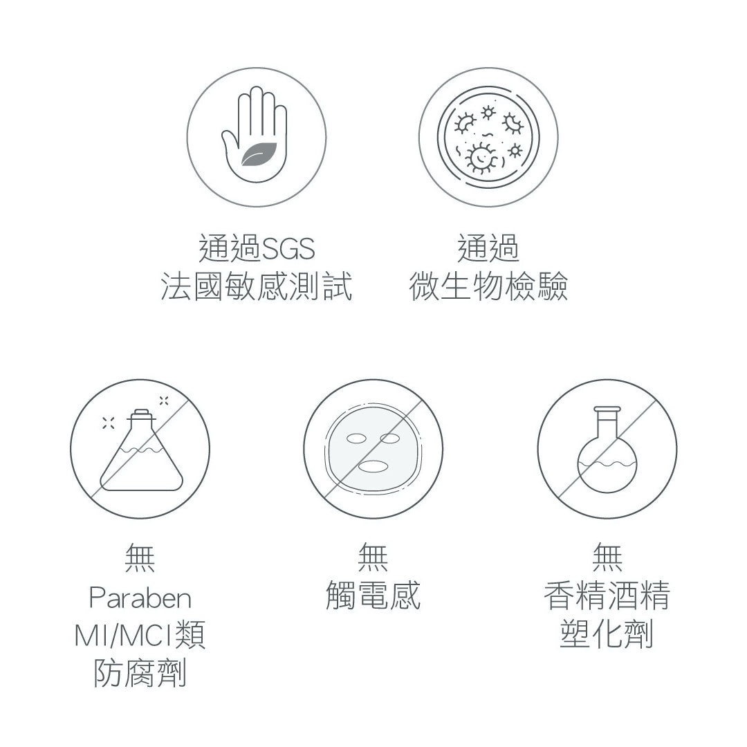 透過微電流保養技術,將具有微型能量的圖案轉印至面膜上,當精華液潤濕面膜布後,無需額外儀器輔助,面膜表面即產生微小電流,帶動精華液深度注入水嫩飽滿,賦活肌膚自然Q彈。