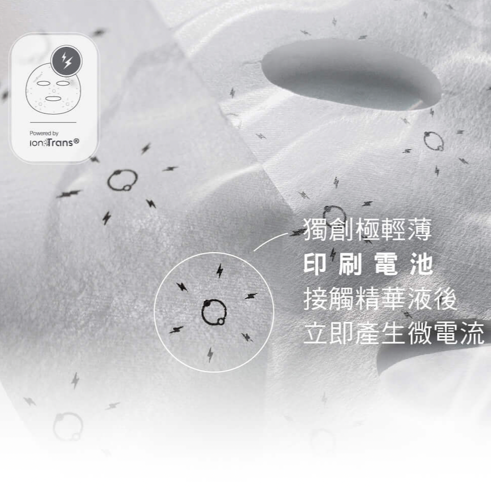 當精華液潤濕面膜布後,無需額外儀器輔助,面膜表面即產生微小電流,帶動精華液深度注入透潤水光,賦活肌膚自然光澤。