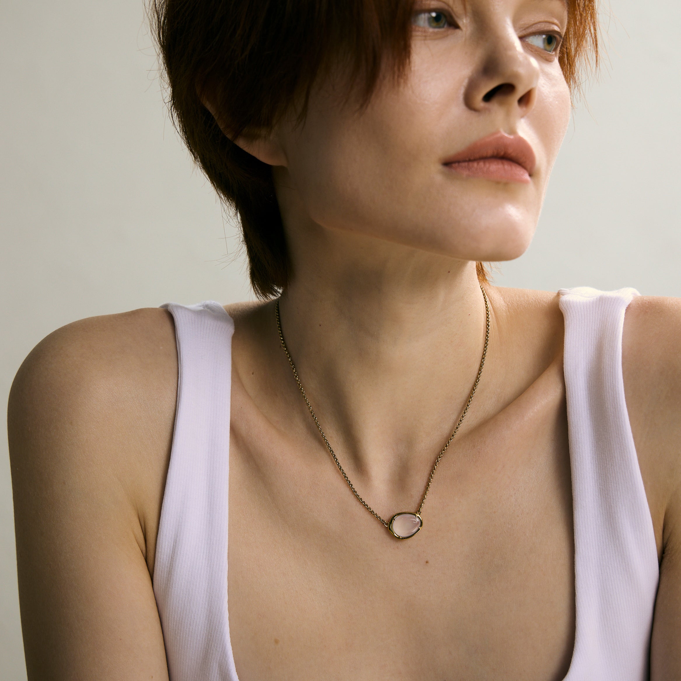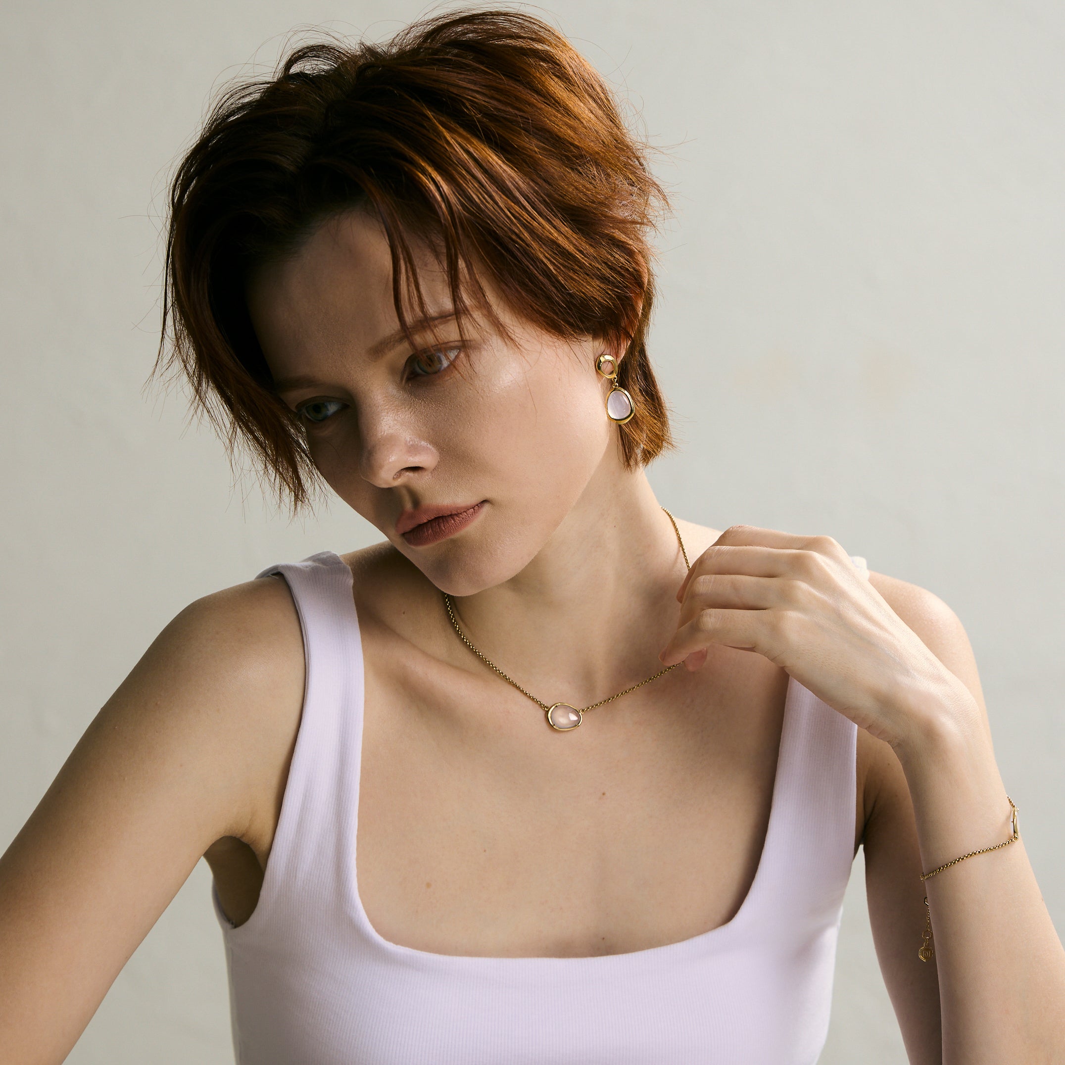 以 316L 不鏽鋼打造,抗敏且耐久,細膩線條襯托晶石的純粹光澤,讓飾品成為生活的靜謐陪伴。天然藍玉髓質地均勻、溫潤細膩,隱約泛出的冷藍色調,如同月光幽微而沉穩。