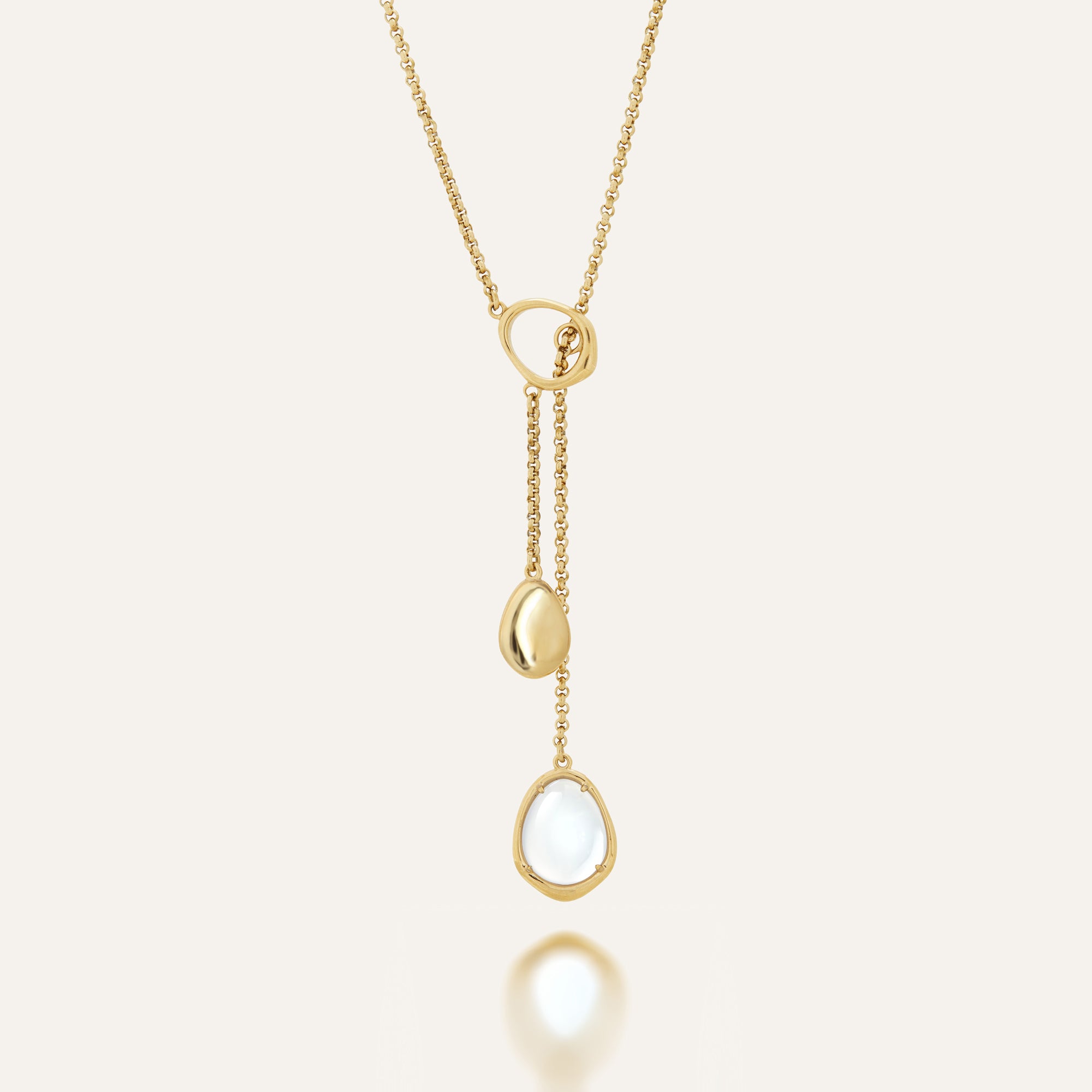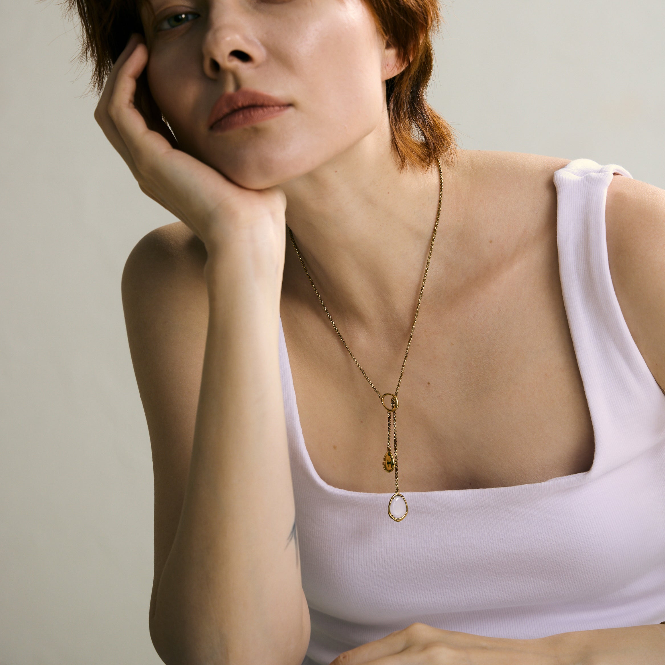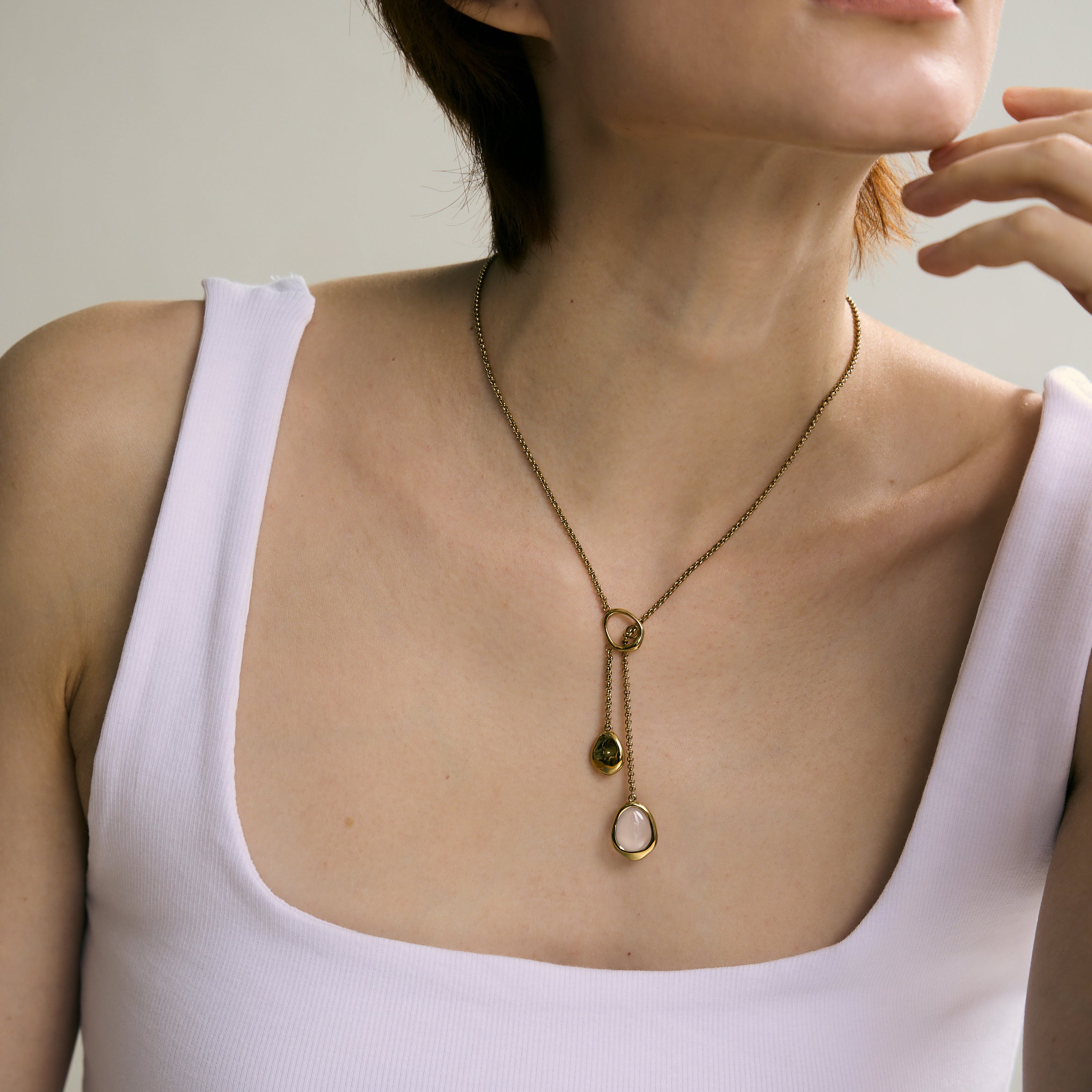 以 316L 不鏽鋼打造,抗敏且耐久,細膩線條襯托晶石的純粹光澤。可調節式雙墜設計巧思,增添穿戴層次與變化,讓飾品成為生活的隨心陪伴。天然藍玉髓質地均勻、溫潤細膩,隱約泛出的冷藍色調,如同月光幽微而沉穩。幫助減少雜念、緩和思緒,並提升表達與溝通能力,創造和諧的人際關係。