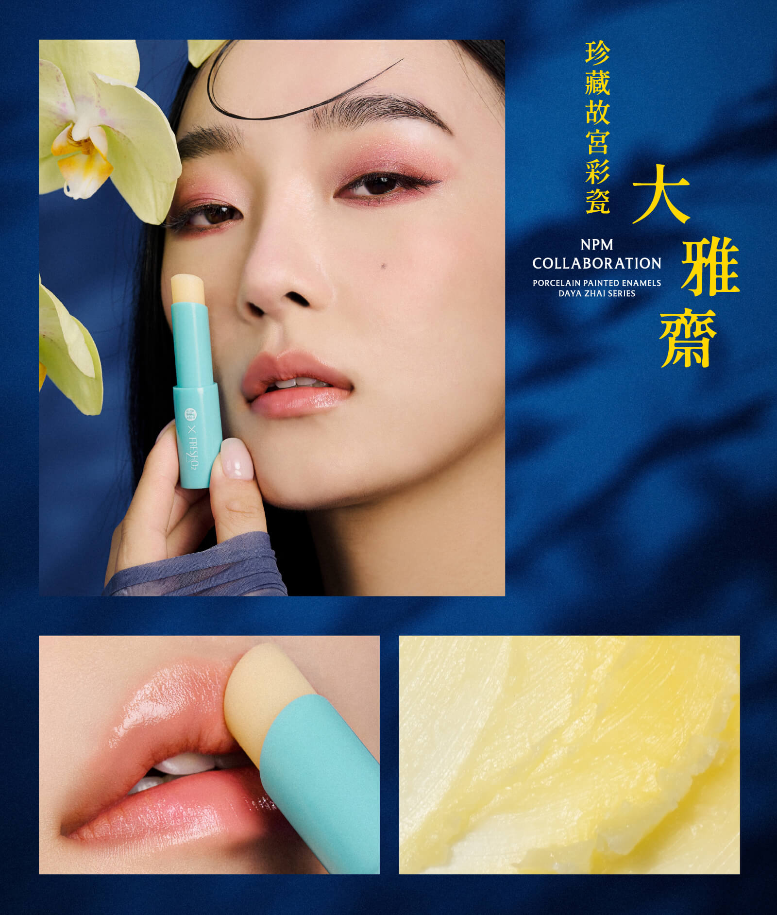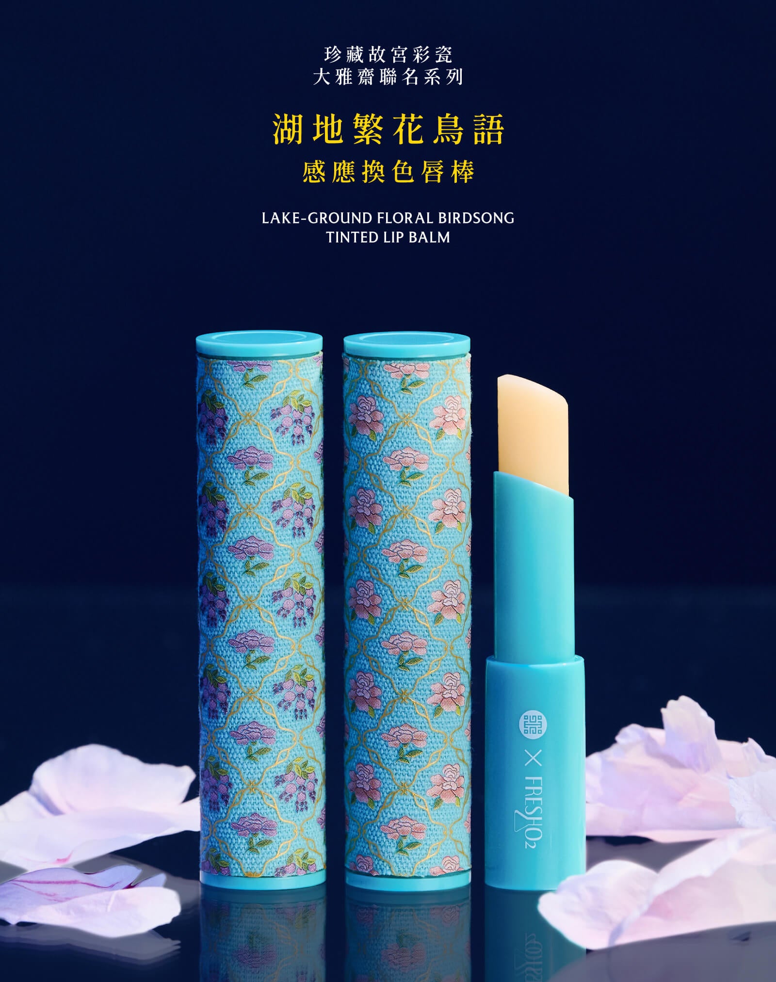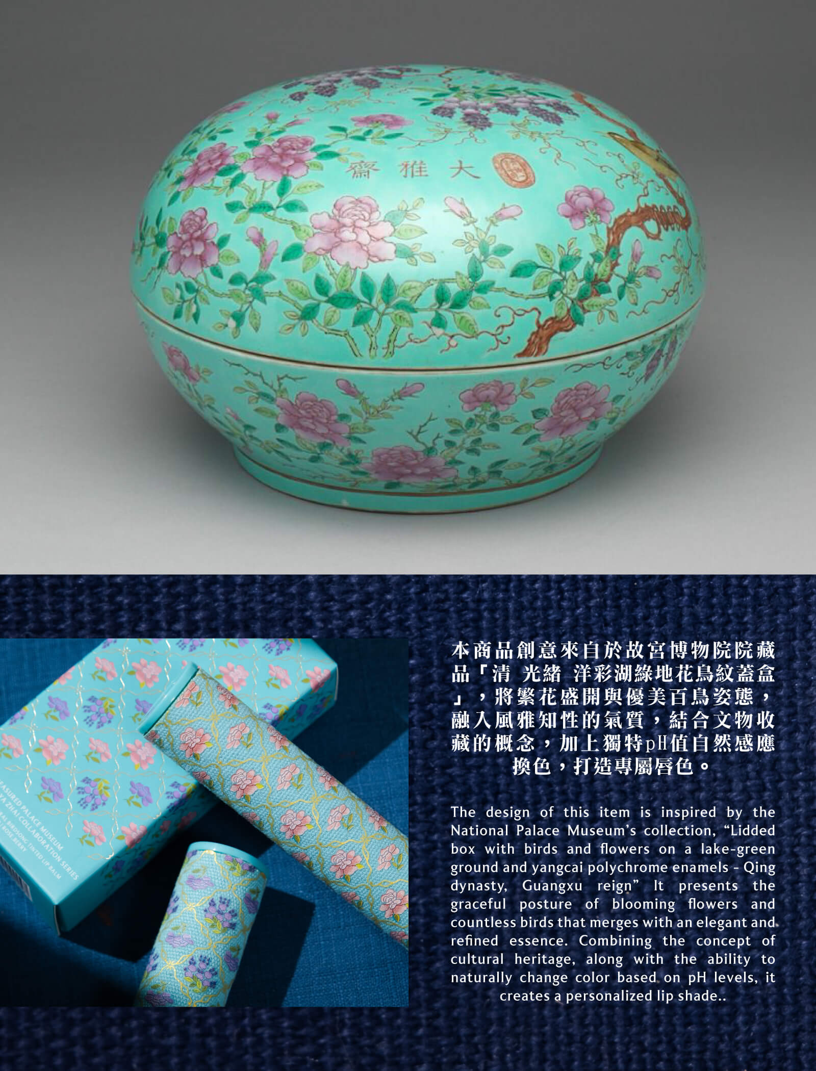 創意來自於故宮博物院院藏品《清 光緒 洋彩湖綠地花鳥紋蓋盒》,將繁花盛開與優美百鳥姿態,融入風雅知性的氣質,結合文物收藏的概念,加上獨特pH值自然感應換色,打造專屬唇色。