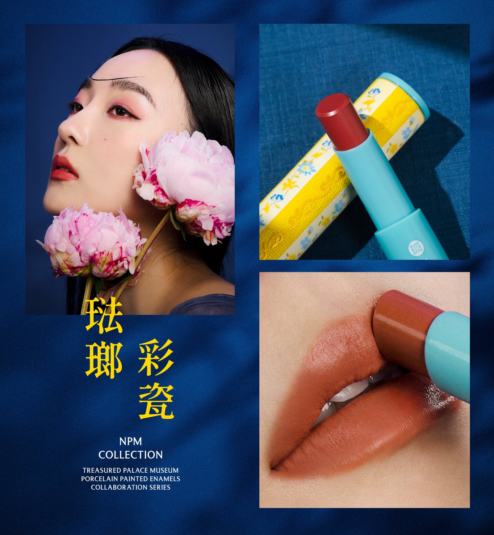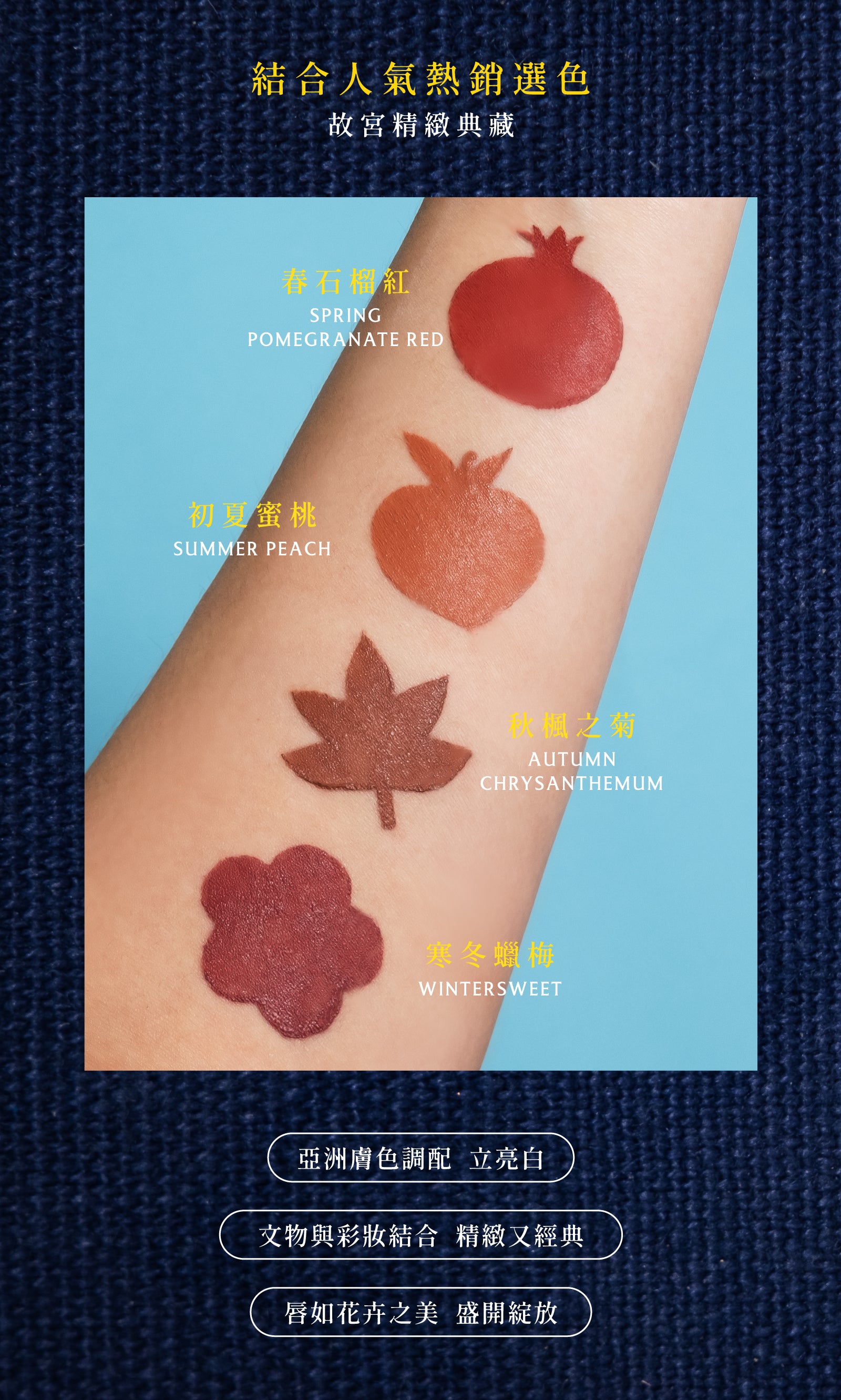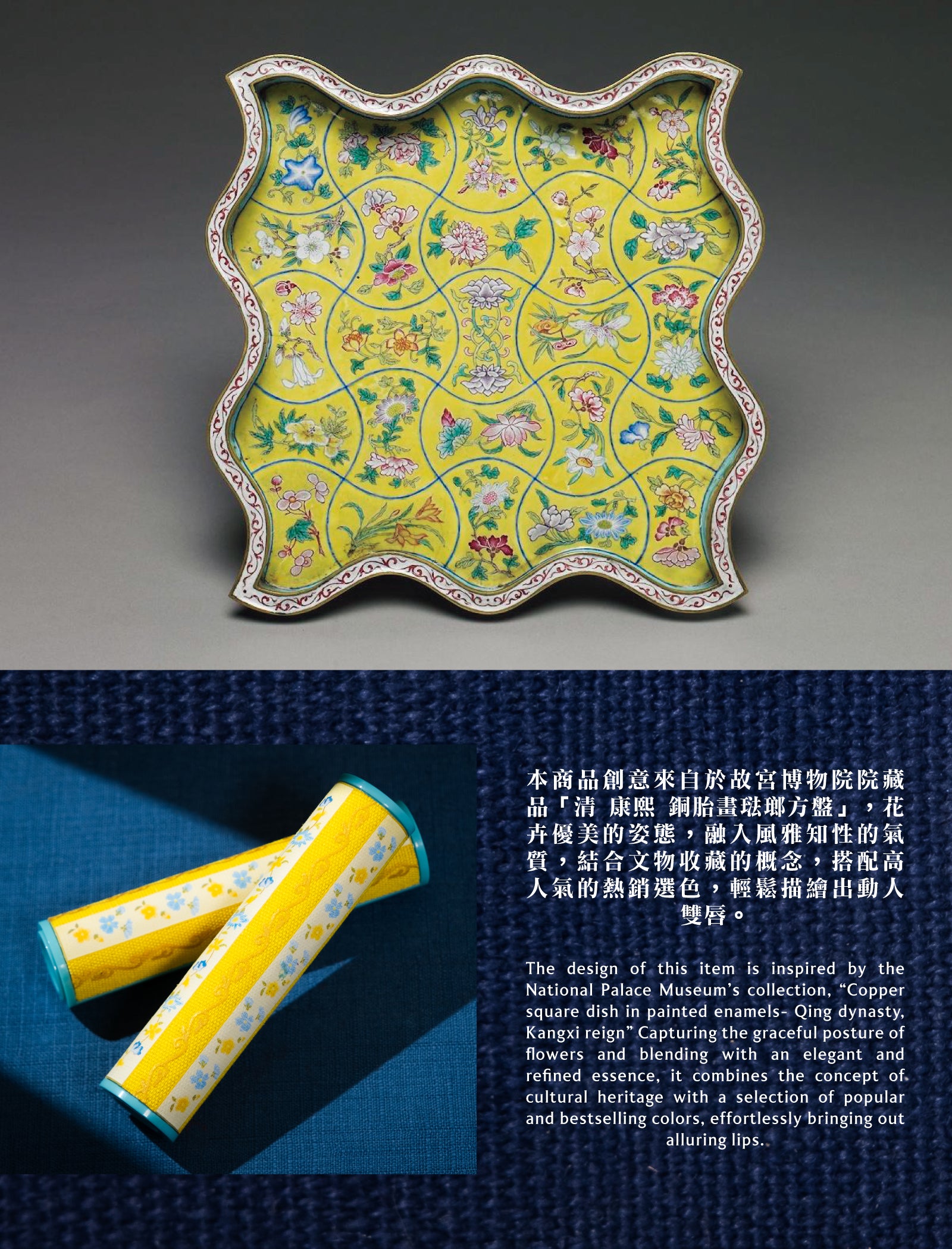 創意來自於故宮博物院院藏品《清 康熙 銅胎畫琺瑯方盤》,花卉優美的姿態,融入風雅知性的氣質,結合文物收藏的概念,搭配高人氣的熱銷選色,輕鬆描繪出動人雙唇。
