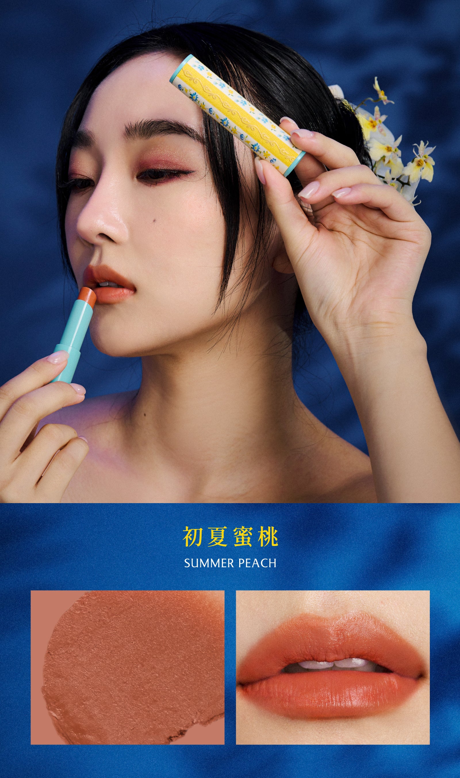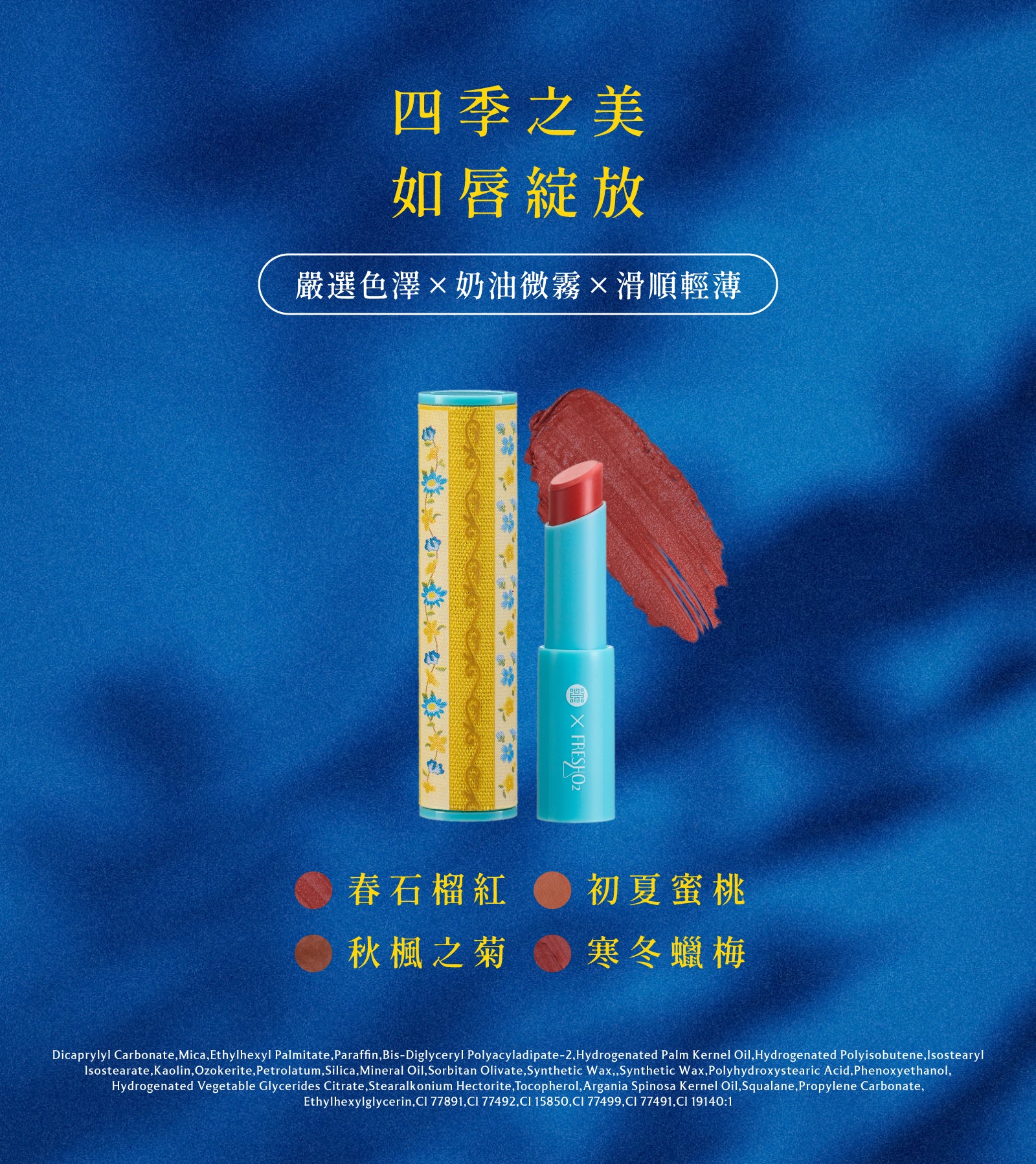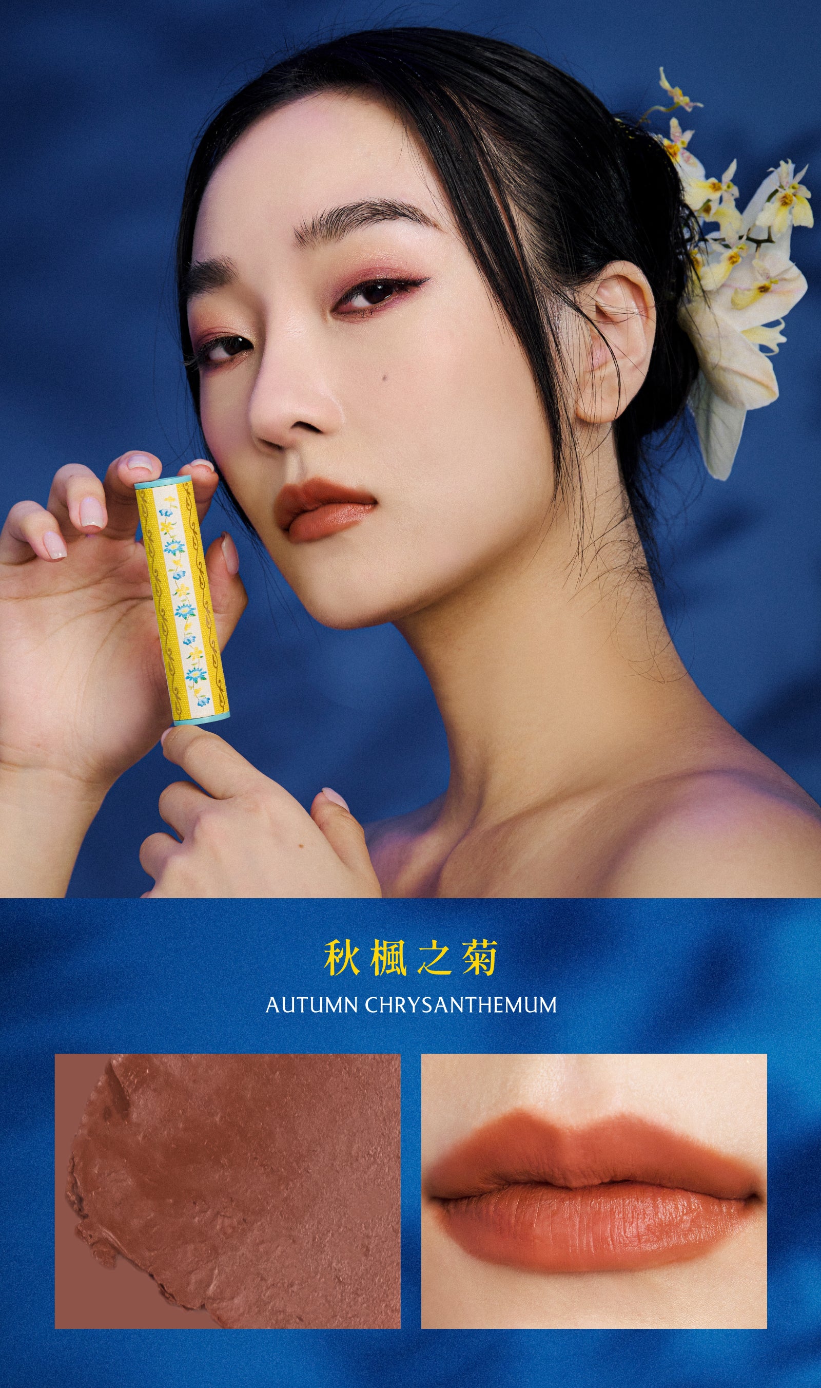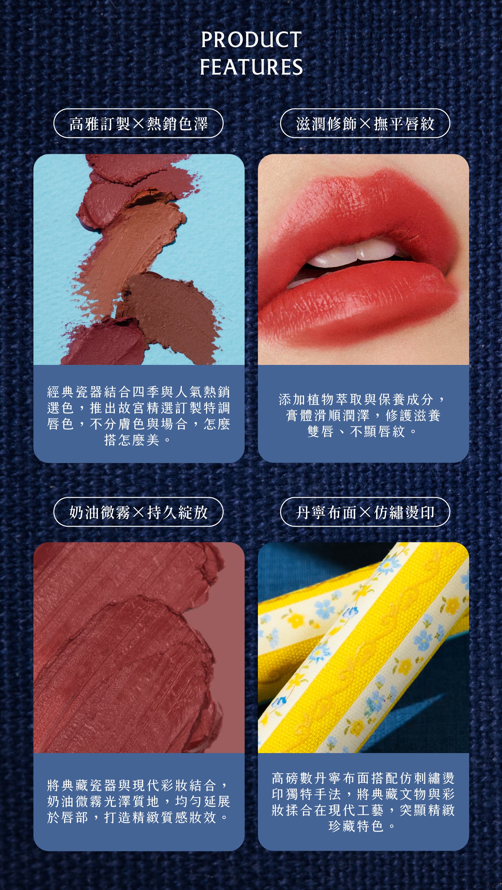創意來自於故宮博物院院藏品《清 康熙 銅胎畫琺瑯方盤》,花卉優美的姿態,融入風雅知性的氣質,結合文物收藏的概念,搭配高人氣的熱銷選色,輕鬆描繪出動人雙唇。