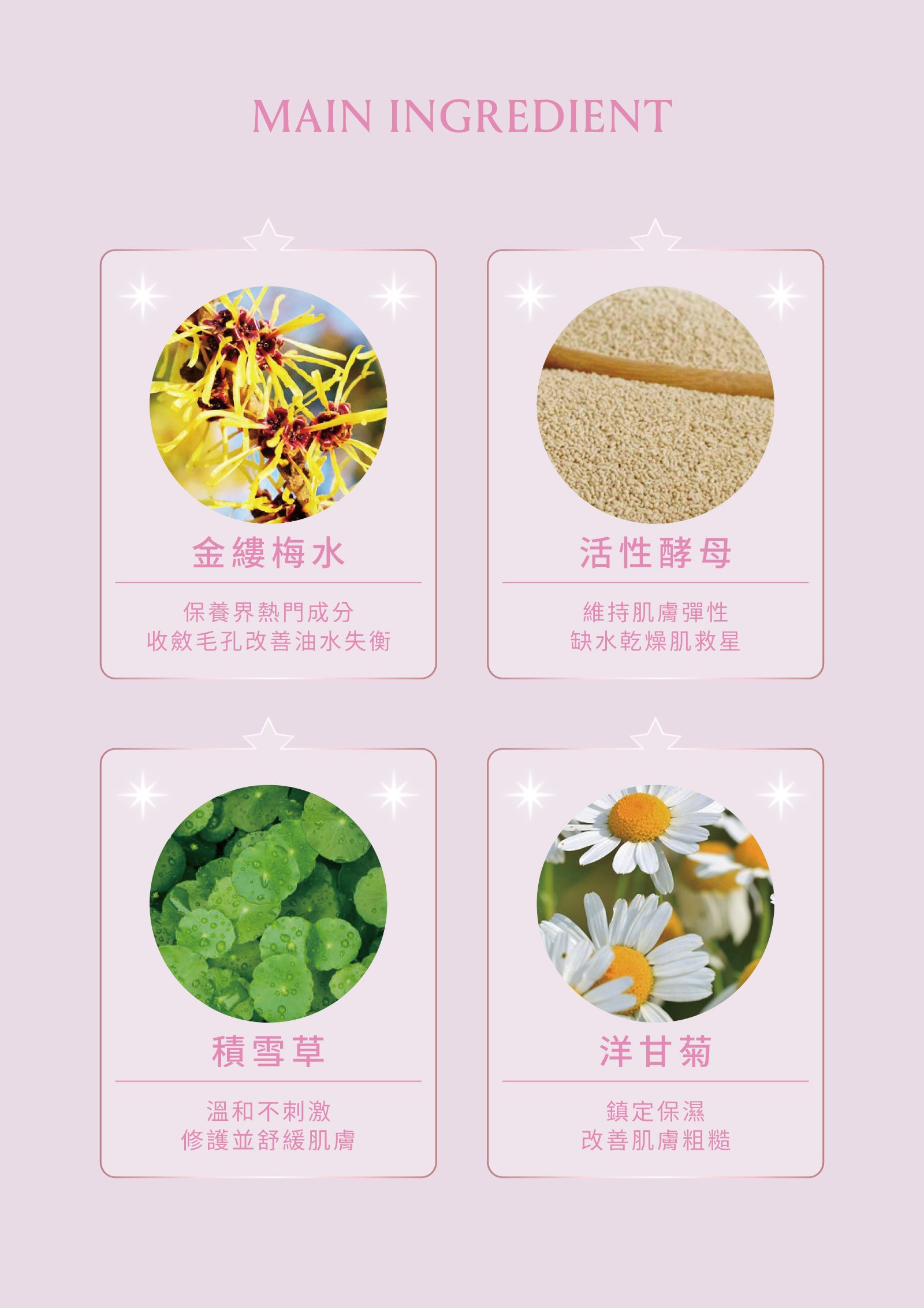 因為工作關係常常需要熬夜及長時間保持上妝狀態,為了強化肌膚的保護力,這次的保養品挑選「金縷梅水」「活性酵母」「積雪草」「洋甘菊萃取」等一系列滋養肌膚的成份,提高肌膚保水量,養成澎潤柔軟的肌膚♥