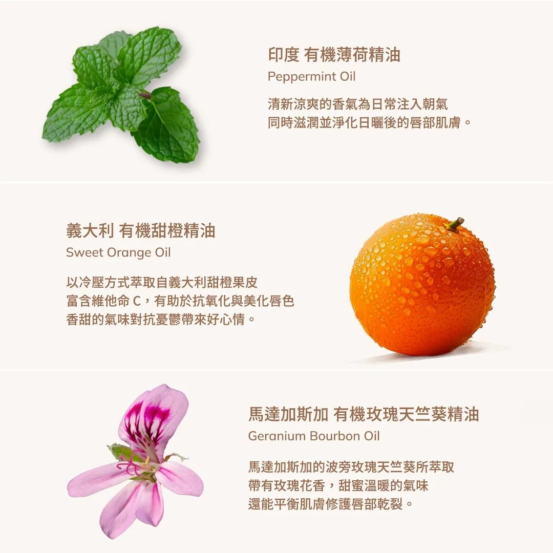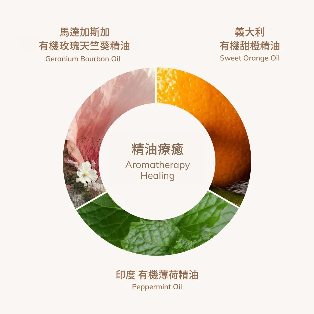 「義大利甜橙」、「印度薄荷」、「波旁玫瑰天竺葵」有機植萃精油