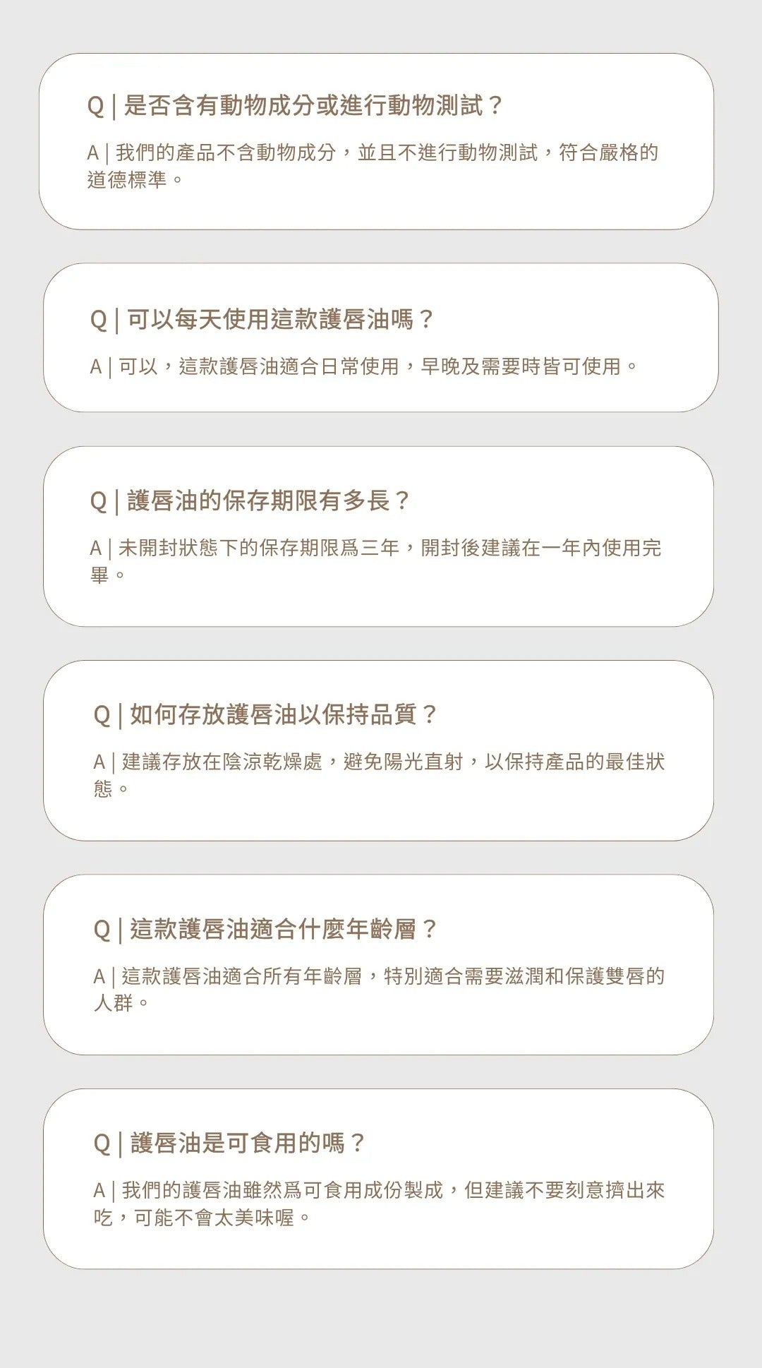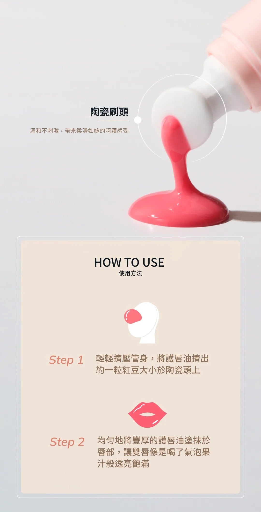 不論是晨起前的妝前打底,或睡前的修護保濕,這瓶護唇油都是你隨身攜帶的唇部維他命— 在每一次補擦之間,讓唇瓣感受到被認真對待的呵護感。