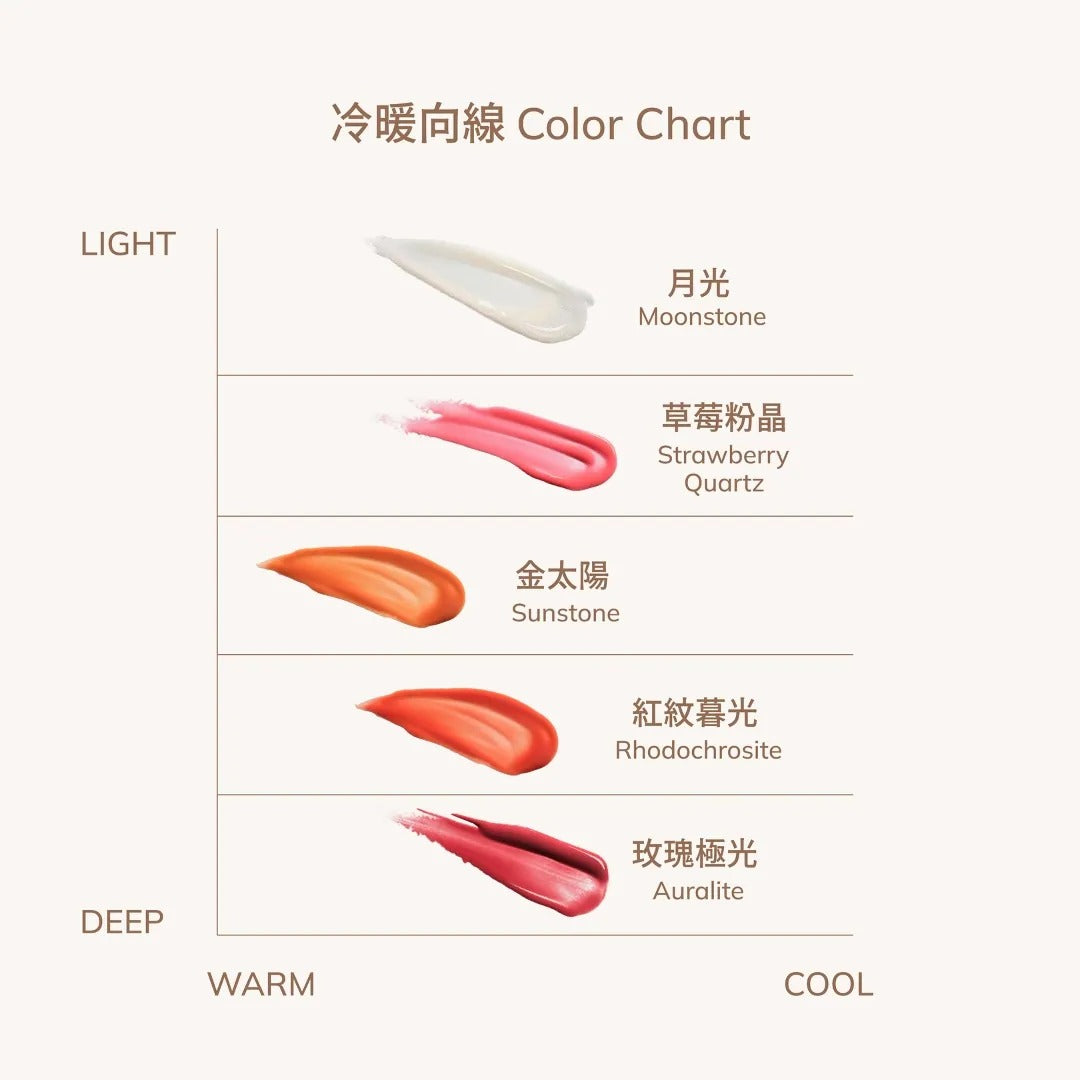 |月光 Moonstone 自然透亮,帶有晶瑩剔透的珍珠光澤,增添唇部光采,適合日常護唇、萬能疊擦