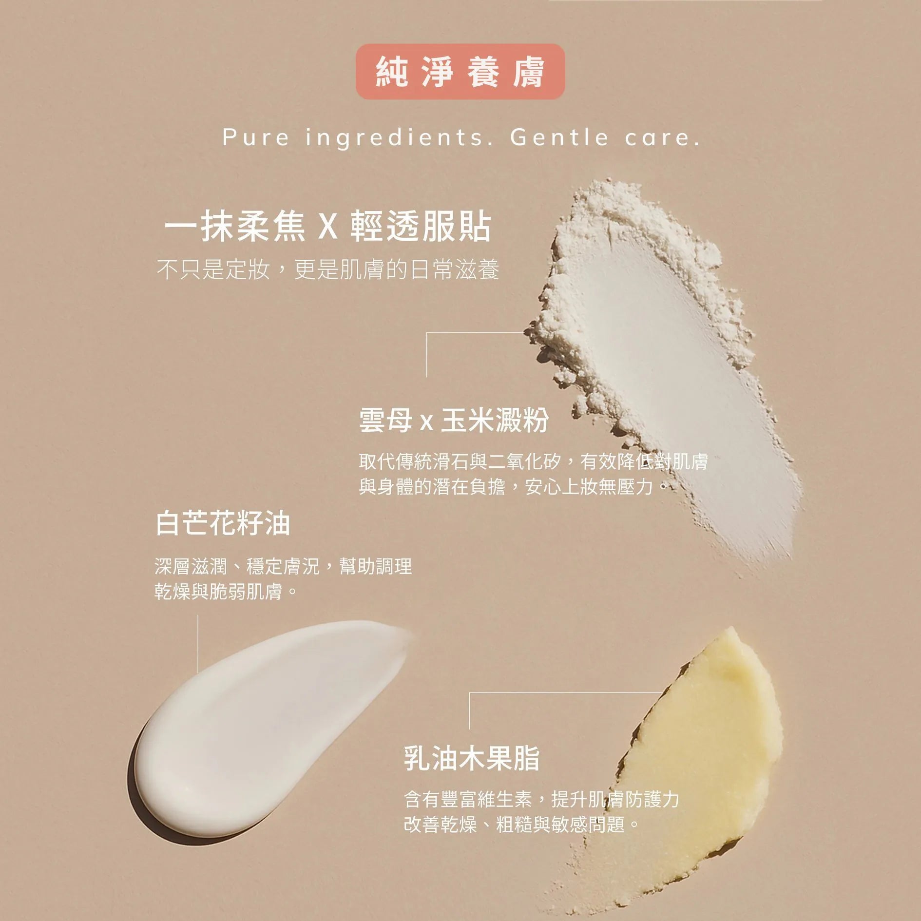 白芒花籽油 x 乳木果油 ,上妝同時養膚,在遮瑕與定妝之間,加入修護與安心。