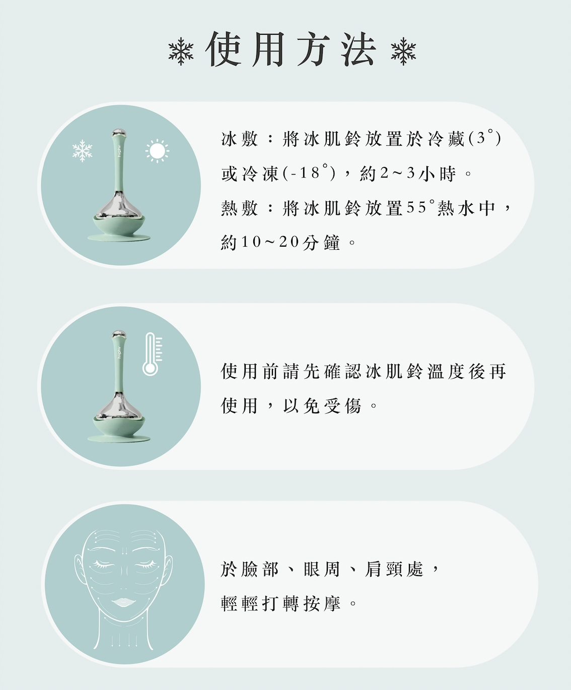.請於使用前,確認產品的溫度(建議取出後靜置1分鐘後再使用),避免產品過度低溫/高溫時使用,以免肌膚凍傷或燙傷皮膚。
