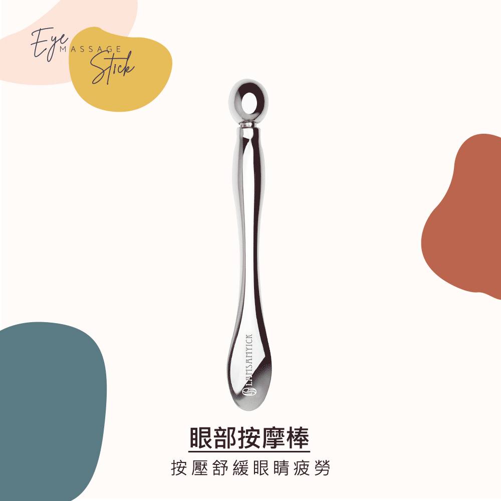●眼部按摩棒(鋅合金):利用圓端貼近眼下肌膚,由眼頭滑動到眼尾,並分別按摩眼周上下。點壓眼周穴道,可以活絡眼周血液循環,減輕眼壓。