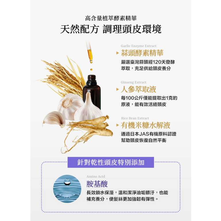嚴選臺灣蒜頭經120天發酵萃取,充足供給頭皮養分