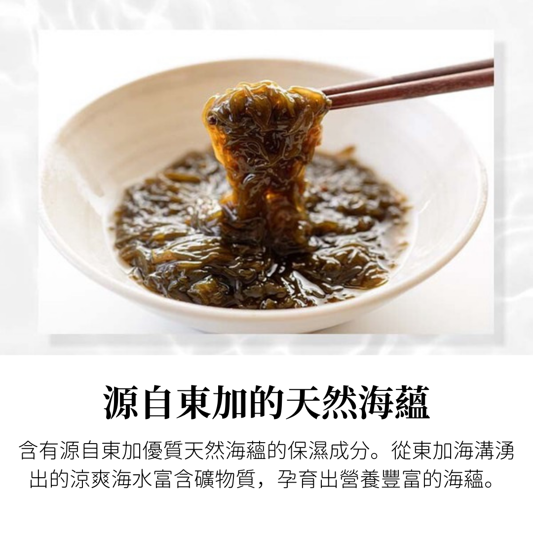 源自東加的天然海蘊:含有源自東加優質天然海蘊的保濕成分。從東加海溝湧出的涼爽海水富含礦物質,孕育出營養豐富的海蘊。