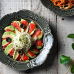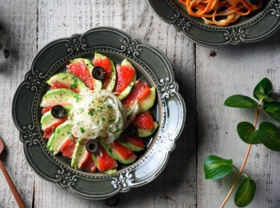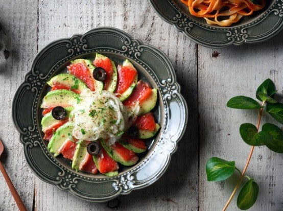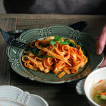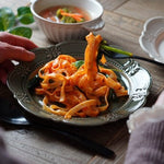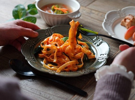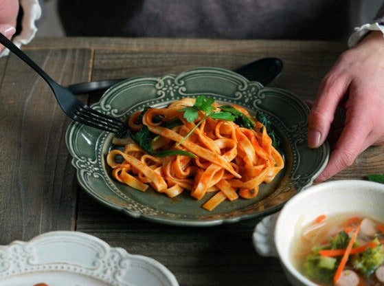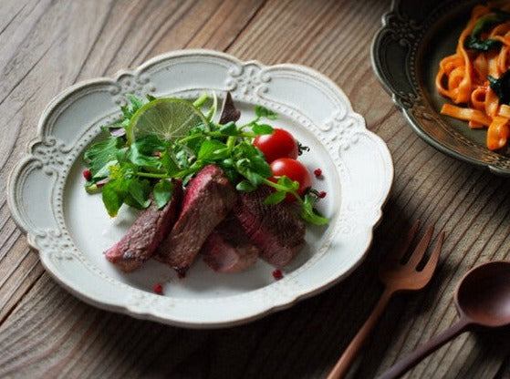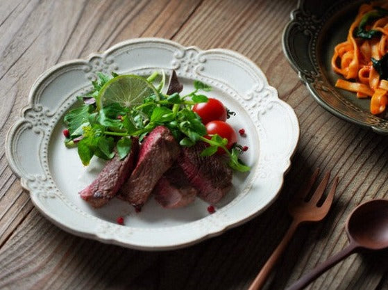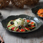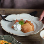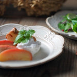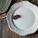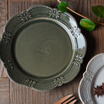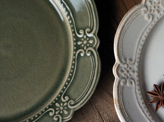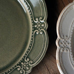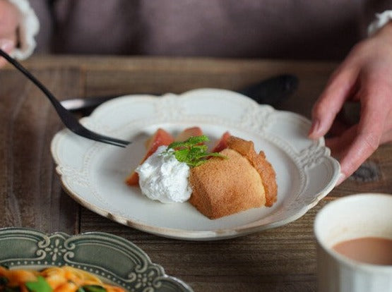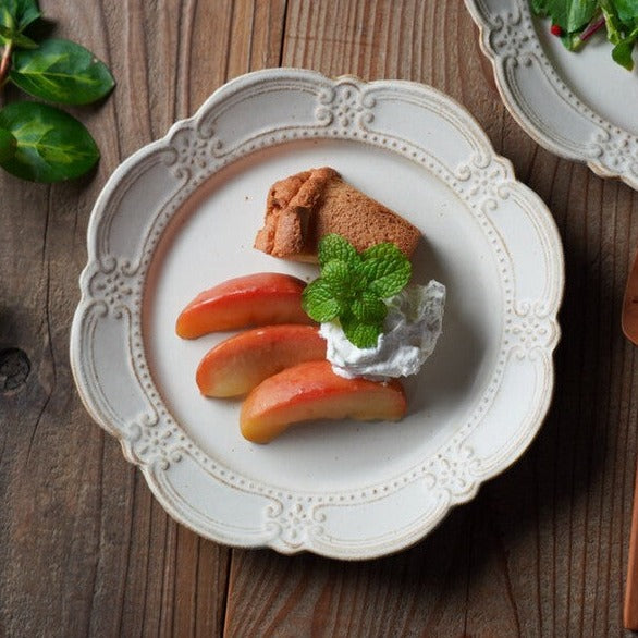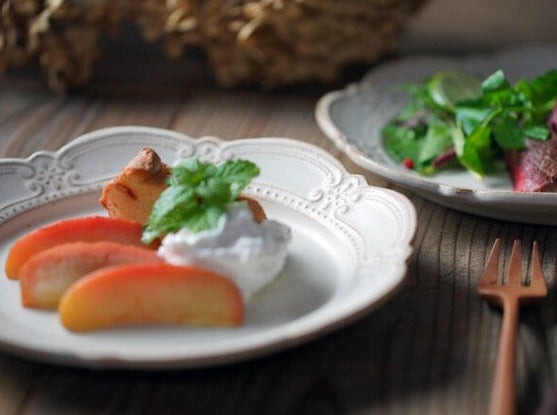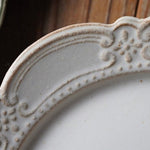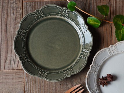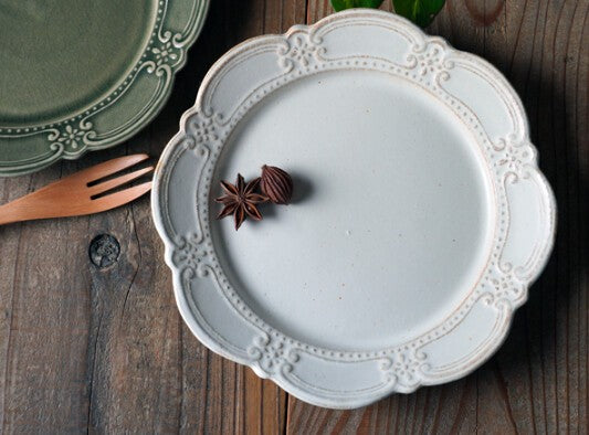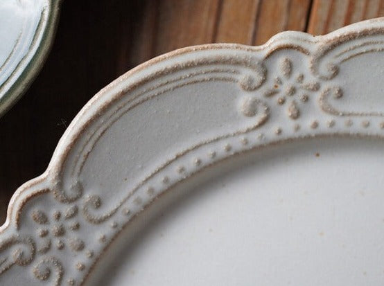 這款益子燒中盤以格林童話「白雪公主」中的魔鏡發想,復古華麗的盤緣裝飾非常美麗。
