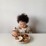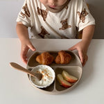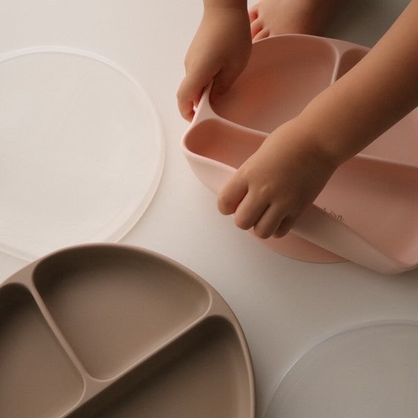 底部帶有吸盤的矽膠盤,可以粘在桌子上,方便兒童使用,安全且能防止傾倒。