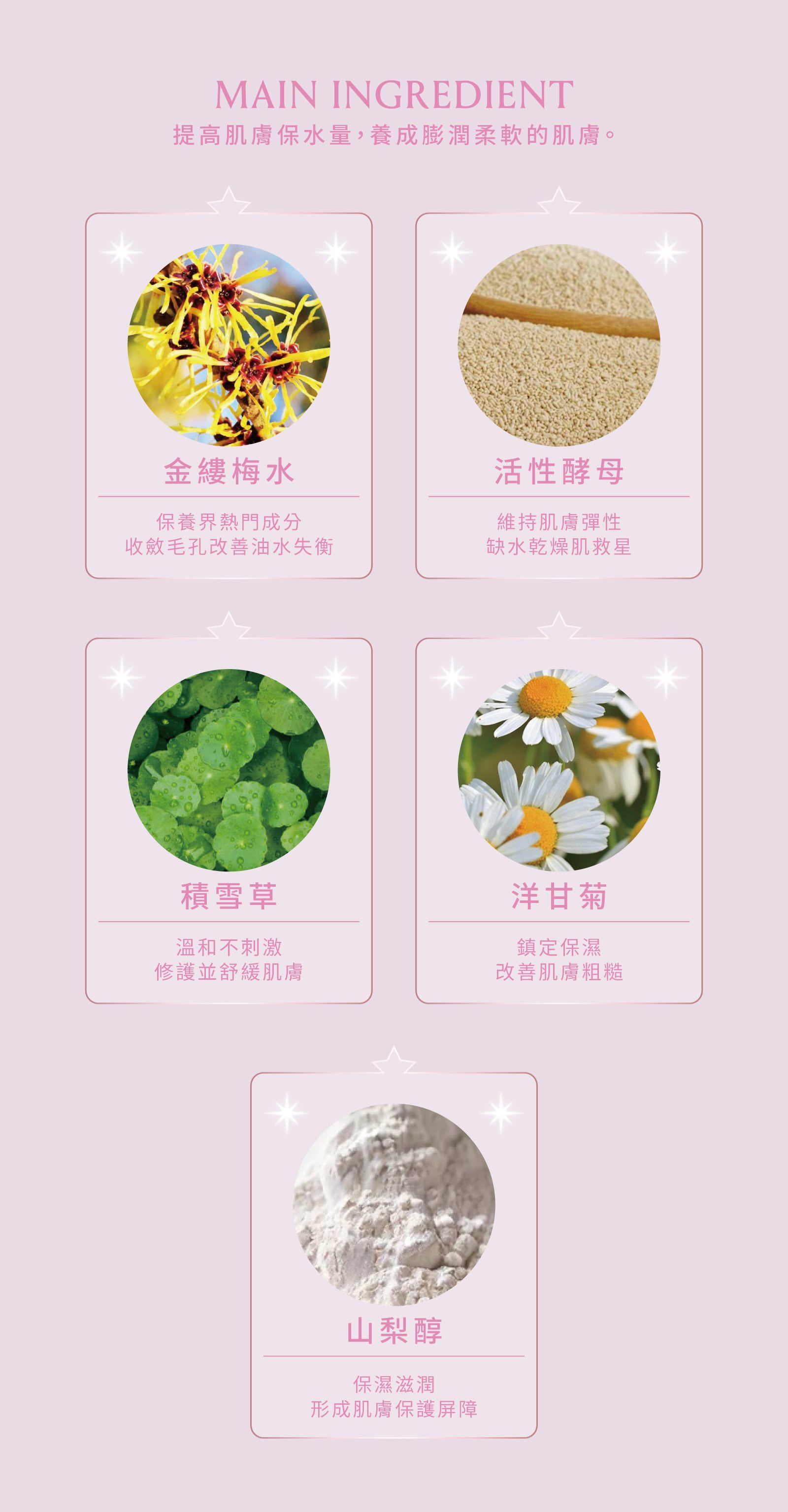 為了強化肌膚的保護力,這次的保養品挑選「金縷梅水」「山梨醇」「活性酵母」「積雪草」「洋甘菊萃取」等一系列滋養肌膚的成份,提高肌膚保水量,養成澎潤柔軟的肌膚♥