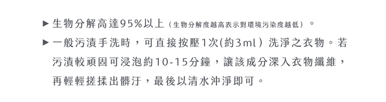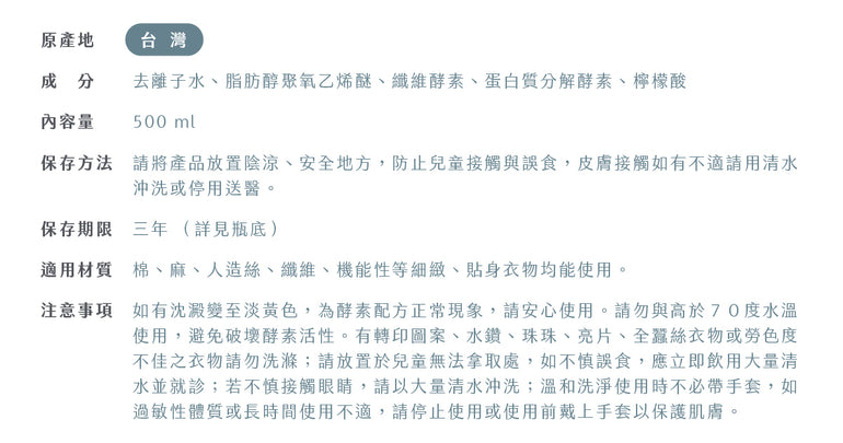 請勿與高於 70 度水溫使用,避免破壞酵素活性。有轉印圖案、水鑽、珠珠、亮片、全蠶絲衣物或勞色度不佳之衣物請勿洗滌 ; 請放置於兒童無法拿取處,如不慎誤食,應立即飲用大量清水並就診 ; 若不慎接觸眼睛,請以大量清水沖洗 ; 溫和洗淨使用時不必戴手套,如過敏性體質或長時間使用不適,請停止使用或使用前帶上手套以保護肌膚。