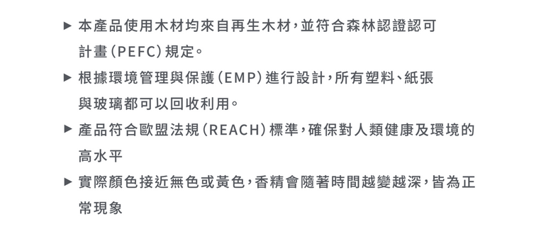 3.香氛精油顏色會因存放而變深或產生些微沈澱物,皆屬正常現象,不影響使用及功效。