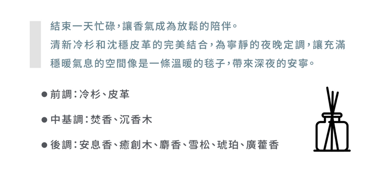 後調:安息香的溫暖氣息搭配雪松與廣藿香,像是一條溫暖的毯子,帶來深夜的安定感。