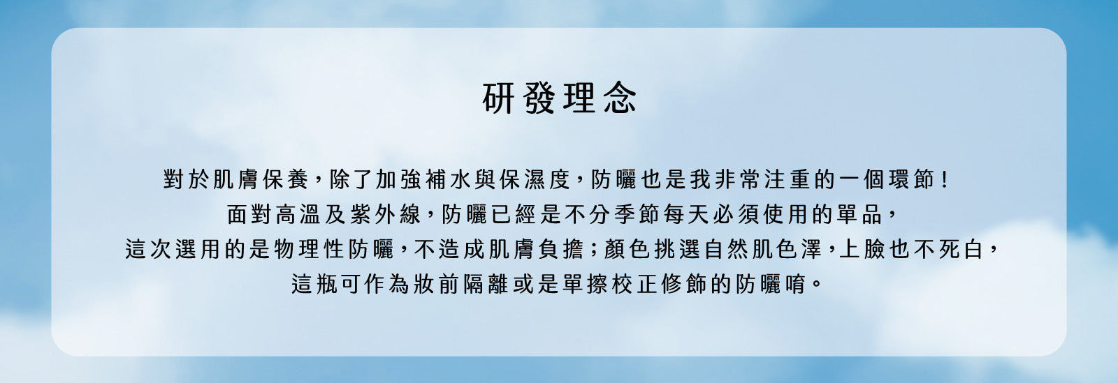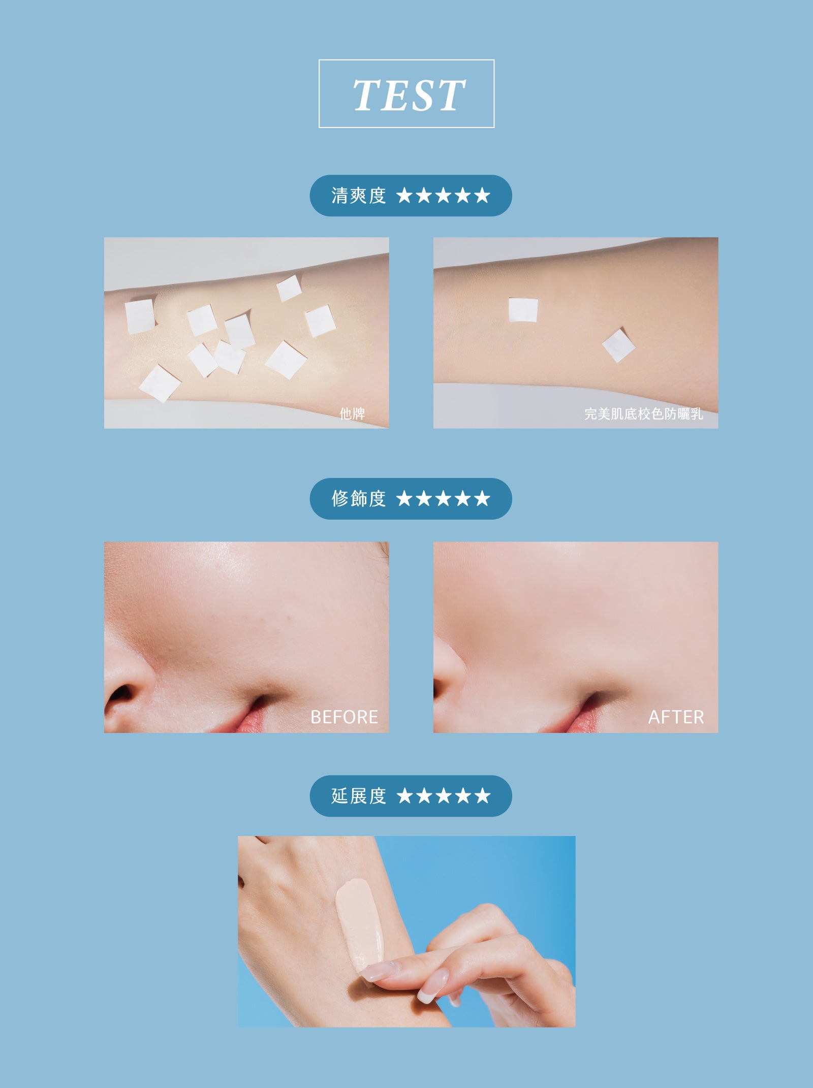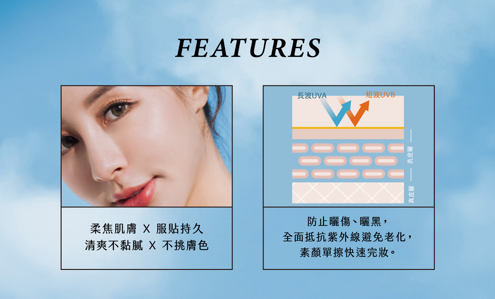 質地清爽不黏膩,選用高係數的物理性防曬,不造成肌膚負擔,柔焦肌膚毛孔、修飾膚色不泛白,隔離紫外線的傷害,創造完美無瑕的妝感。