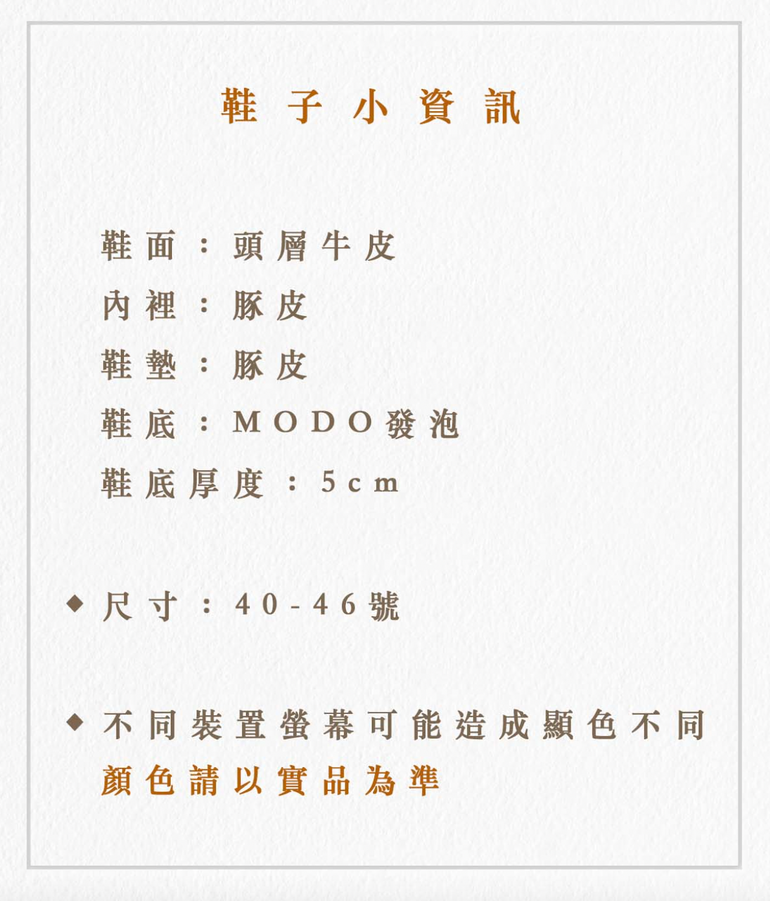 註:每雙鞋款皆為手工訂製,恕不退換,下單前請參考尺寸說明、試穿報告選擇適合尺寸。一般商品訂製時間為75天。如遇假期,將順延出貨日。